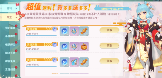 活動期間,冒險者累計消耗魔幣達到指定檔位可領取聲望、晶印、晶核、萬聖糖果、南瓜頭、萬聖奇遇盒•傳說等獎勵喔
