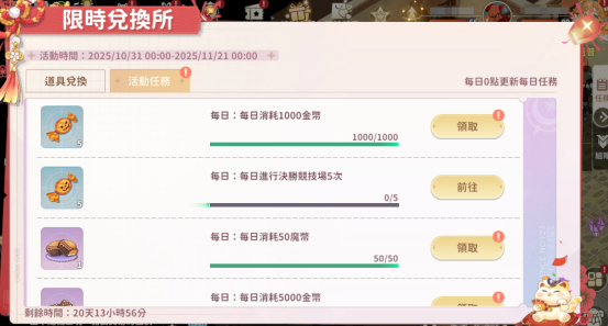 活動期間,冒險者於活動期間,完成“每日消耗金幣、每日進行決勝競技場、每日消耗魔幣、每日消耗金幣、使用萬聖奇遇盒、消耗刮刮卡、消耗楓糖漿松餅“等任務,即可獲得萬聖糖果、南瓜頭、女巫帽、牛奶巧克力、榛果巧克力、鼠王刮刮樂獎券、萬聖奇遇盒·極品、萬聖奇遇盒·傳說等獎勵喔