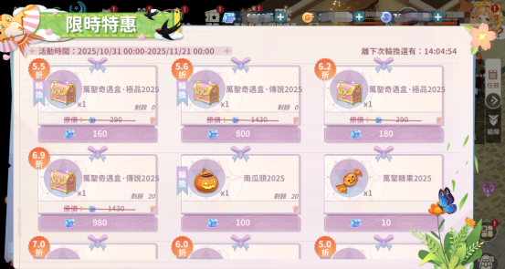 活動期間,魔力寶貝為各位冒險者準備了限時特惠好禮,最高可5.0折購買超值商品,商品包括:萬聖奇遇盒•極品、萬聖奇遇盒•傳說、南瓜頭、萬聖糖果、晶印飾品禮盒、淬晶隨機禮包、奇跡種子、改魂圖、龍鱗等獎勵喔