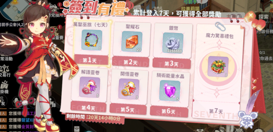 活動期間,冒險者每日登入,可獲得萬聖巫旅(7天),聖耀石,銀幣,解語靈卷,開悟靈卷,騎術能量水晶,魔力驚喜禮包獎勵