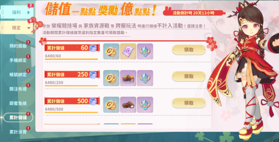 活動期間,冒險者累計儲值魔幣達到指定檔位可領取金幣、改魂圖、晶印、牛奶巧克力、榛果巧克力、馴養經驗禮盒、新聲望禮盒、蛇年紅包、女巫帽、鼠王刮刮樂獎券、超級護佑等獎勵喔