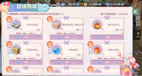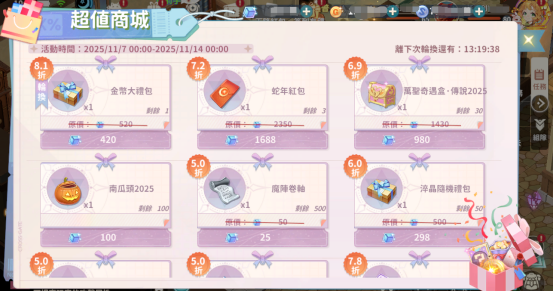 活動期間(11月07日0點-11月14日0點),魔力寶貝為各位冒險者準備了限時特惠好禮,最高可5.0折購買超值商品,商品包括:金幣大禮包、蛇年紅包、萬聖奇遇盒•傳說、南瓜頭、魔陣卷軸、改魂圖、晶印、魔塵隨機禮包(傳說)等獎勵喔