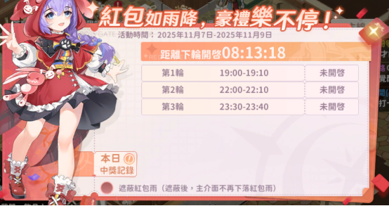 活動期間(11月07日-11月09日);每日12:00-13:00 每日22:00-23:00開啟,